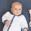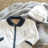 This velvet jacquard romper is white and has long sleeves, feet and a blue collar. The press studs over the entire length up to the feet offer extra ease when changing. As an extra detail, the baby suit has a decorative border along the press studs.